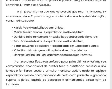 “A empresa manifesta seu profundo pesar pelas vítimas e reafirma seu compromisso incondicional de prestar toda a assistência necessária aos feridos e familiares, desde o primeiro momento após o acidente, equipes especializadas estão acompanhando de perto cada paciente, e garantindo suporte logístico, custeio de despesas e comunicação direta com os familiares”, disse.