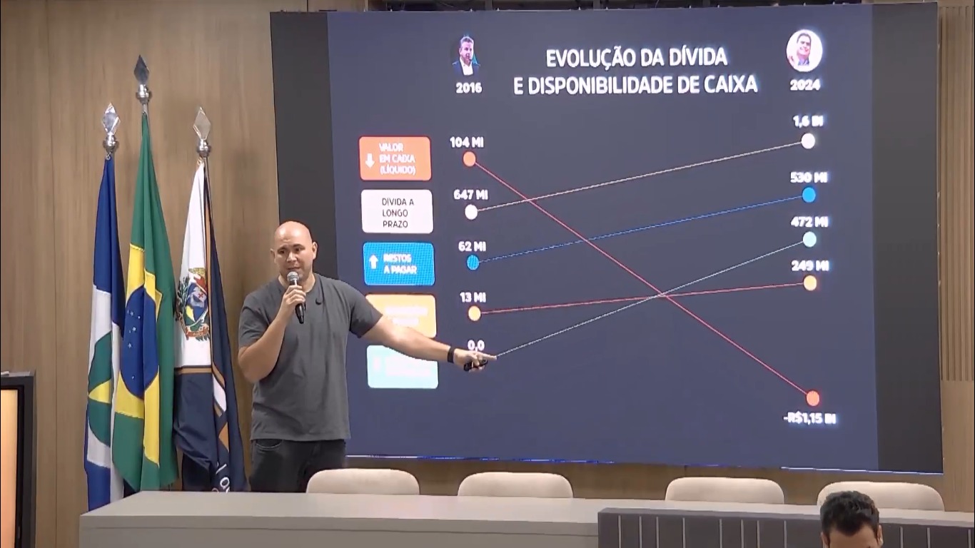 Durante a apresentação, o prefeito comparou os números herdados com os de gestões anteriores. Ele destacou que Mauro Mendes (União) entregou a Prefeitura com R$ 104 milhões em caixa, enquanto Emanuel deixou um rombo de R$ 1,15 bilhão.