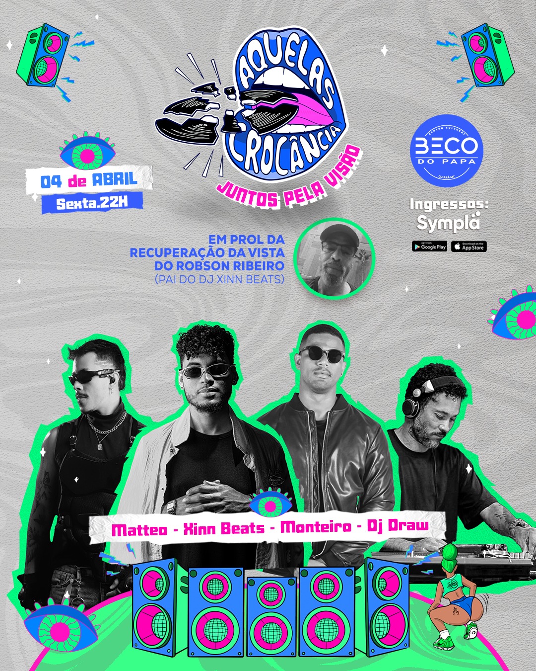 Com o tema “Juntos em prol da visão”, o evento acontece nesta sexta-feira (4), no Beco do Papa, a partir das 22h, e promete seis horas de muita música. A line-up conta com os DJs Monteiro, Draw, Matteo e Xinn Beats, nome artístico de Vinicius Quintino, filho de Robson e idealizador da iniciativa.