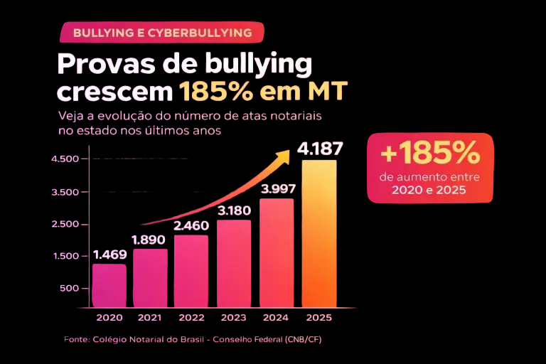 A nova lei que criminalizou o bullying e o cyberbullying já começa a impactar a forma como vítimas buscam proteção em Mato Grosso. Em 2025, o número de atas notariais — utilizadas como prova nesse tipo de crime — chegou a 4.187, o maior já registrado no estado. Em 2024, foram 3.997 documentos. A alta reforça uma tendência de crescimento contínuo desde 2020, quando houve 1.469 registros.