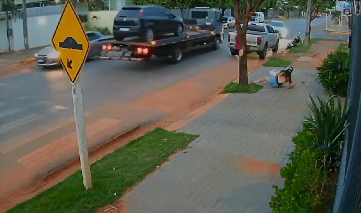 Nas imagens, a vítima aparece em uma motocicleta quando o agressor se aproxima em uma caminhonete, desce do veículo, arremessa um objeto contra ela e parte para a agressão física. A mulher cai no chão e é atingida por chutes, até que um motorista que passava pelo local intervém.