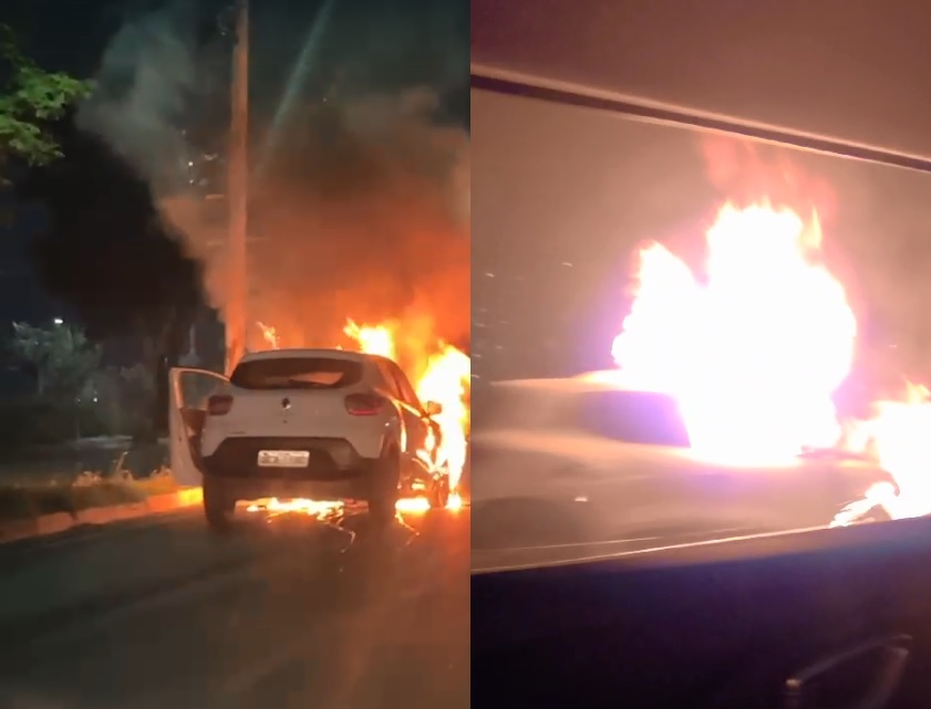 Vídeos que circulam nas redes sociais flagraram o momento em que o carro era consumido pelas chamas, enquanto condutores trafegavam pela via.