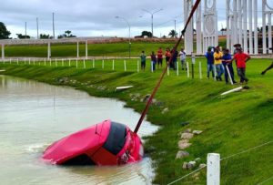 Motorista perde o controle de carro ao estacionar e despenca em lago em MT