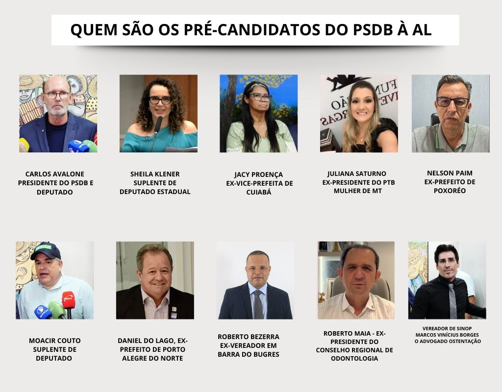 O PSDB-MT oficializou a chegada de novos “puxadores de votos” para fortalecer sua chapa proporcional nas eleições de outubro. Entre os nomes de destaque estão o ex-prefeito de Poxoréo, Nelson Paim, o suplente de deputado Moacir Couto e a ex-vice-prefeita de Cuiabá, Jacy Proença. Eles se juntam ao vereador por Sinop, Marcos Vinícius Borges (conhecido como Advogado Ostentação), e ao presidente estadual da sigla, deputado Carlos Avallone, que buscará a reeleição.