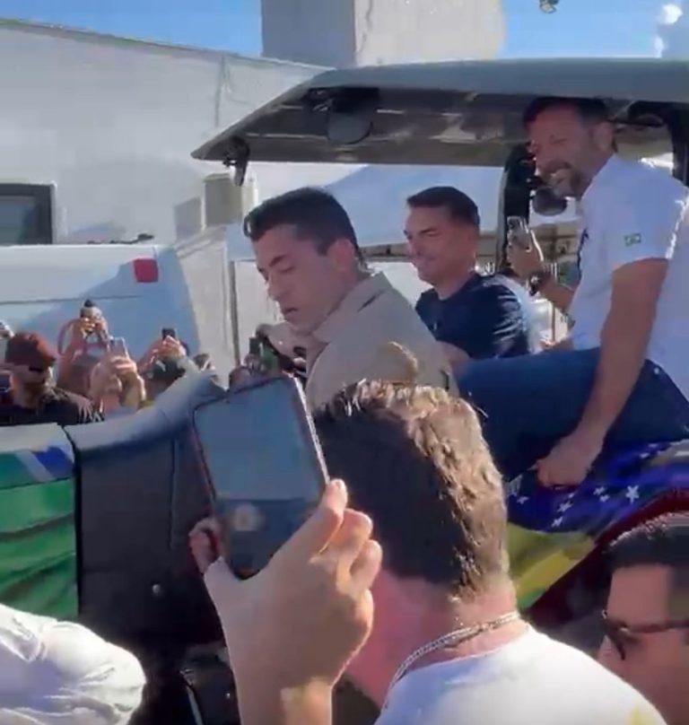 Em Sinop, Flávio Bolsonaro pilota trator personalizado com bandeira do Brasil; vídeo