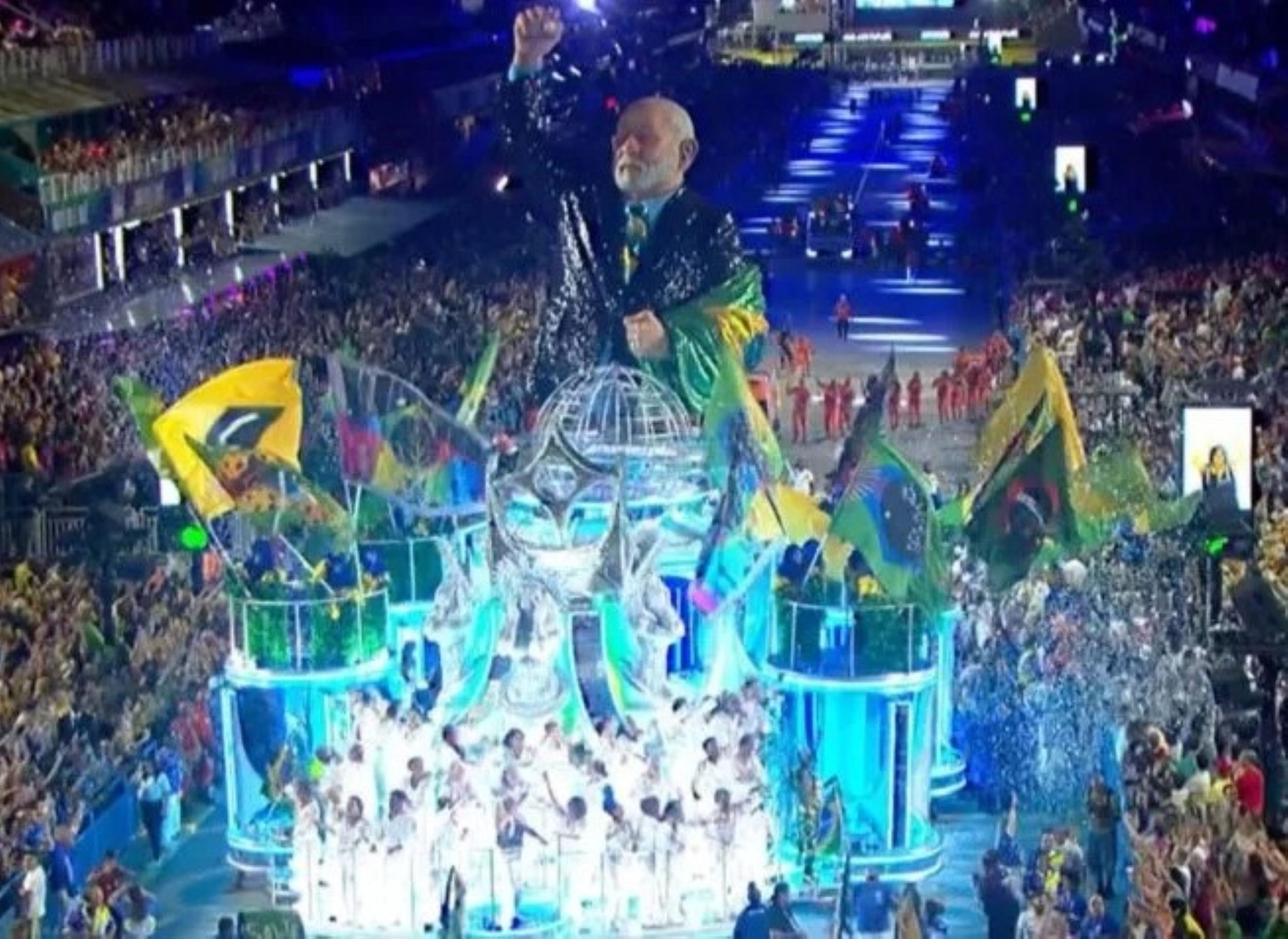 A comissão de frente levou para a Sapucaí uma representação da rampa do Palácio do Planalto, lembrando a última posse de Lula, ao lado de integrantes da sociedade civil. Atores e bailarinos também representaram o ministro Alexandre de Moraes, do STF, e os ex-presidentes Dilma Rousseff, Michel Temer e Jair Bolsonaro.