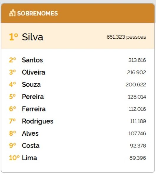 O levantamento também aponta outros sobrenomes recorrentes, como Souza (200.622), Pereira (128.014), Ferreira (112.016), Rodrigues (111.189), Alves (107.746), Costa (92.378) e Lima (89.396).