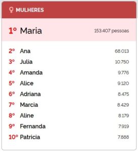 Na sequência aparecem Ana (68.013 registros), Júlia (10.750), Amanda (9.776), Alice (9.110), Adriana (8.475), Márcia (8.475), Aline (8.179), Fernanda (7.919) e Patrícia (7.888), completando o ranking dos dez nomes femininos mais populares.