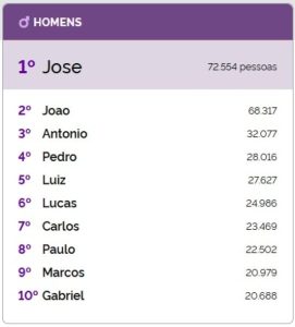 Entre os homens, o nome “José” lidera, com 72.554 registros em Mato Grosso — o equivalente a 1,99% da população. A idade média dos “Josés” é de 50 anos. Em seguida aparecem João (68.317 registros), Antônio (32.077), Pedro (28.016), Luiz (27.627), Lucas (24.986), Carlos (23.469), Paulo (22.502), Marcos (20.979) e Gabriel (20.688).