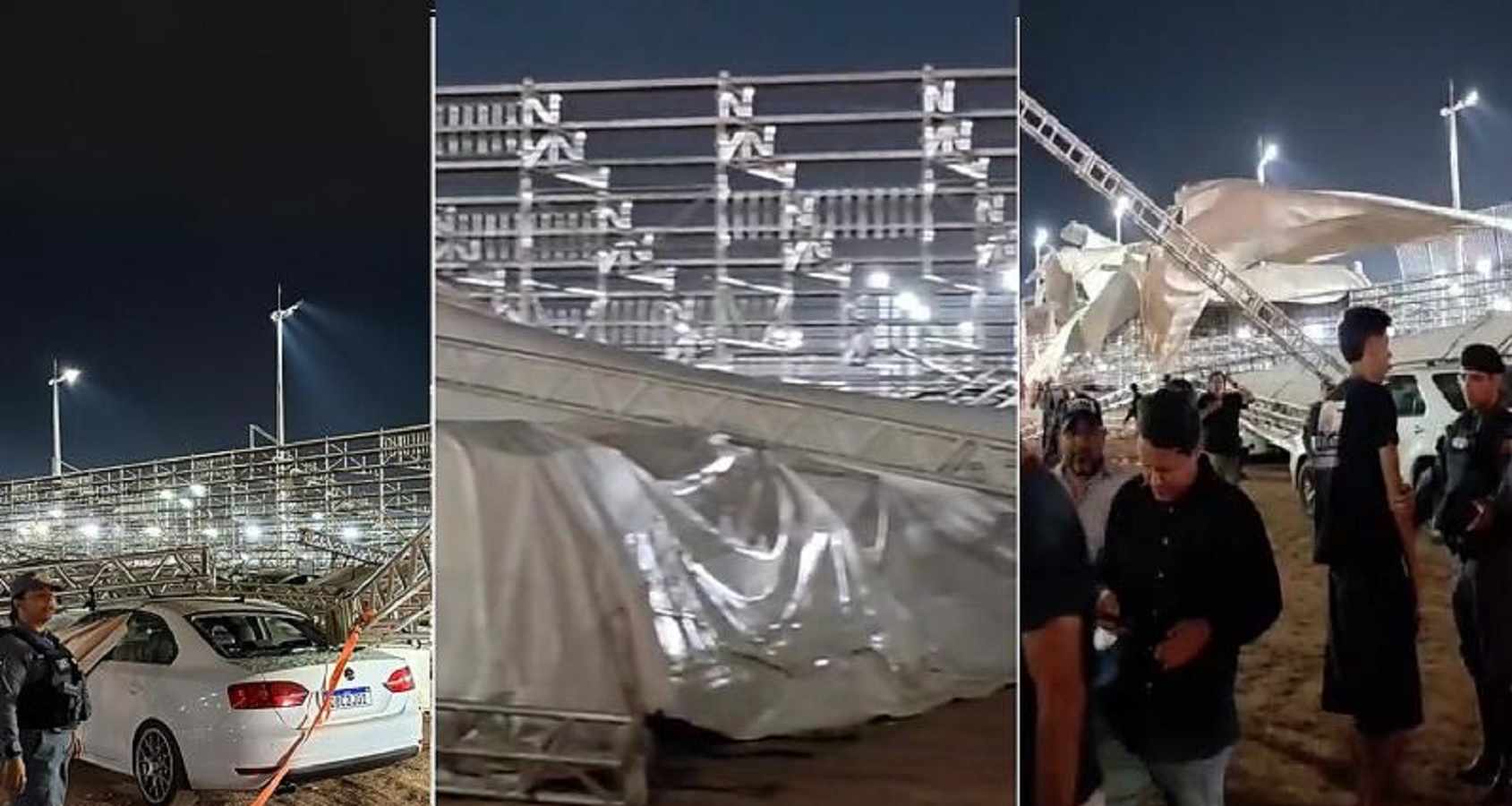 “O evento não será cancelado. Vamos fazer uma avaliação rápida da arquibancada. Acreditamos que tudo vai dar certo. O que danificou foi a estrutura do teto, que acabou tombando para trás com a rajada de vento”, declarou o secretário.