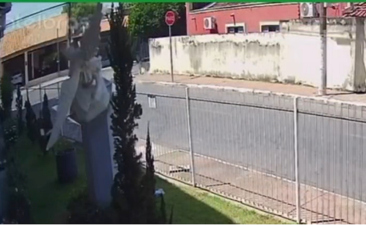 Nas imagens, a mulher aparece pulando o muro para acessar a área externa do templo. Em seguida, ela derruba a escultura que estava sobre um pilar no jardim da paróquia. Com o impacto da queda, a peça sofreu danos visíveis, principalmente nas asas.