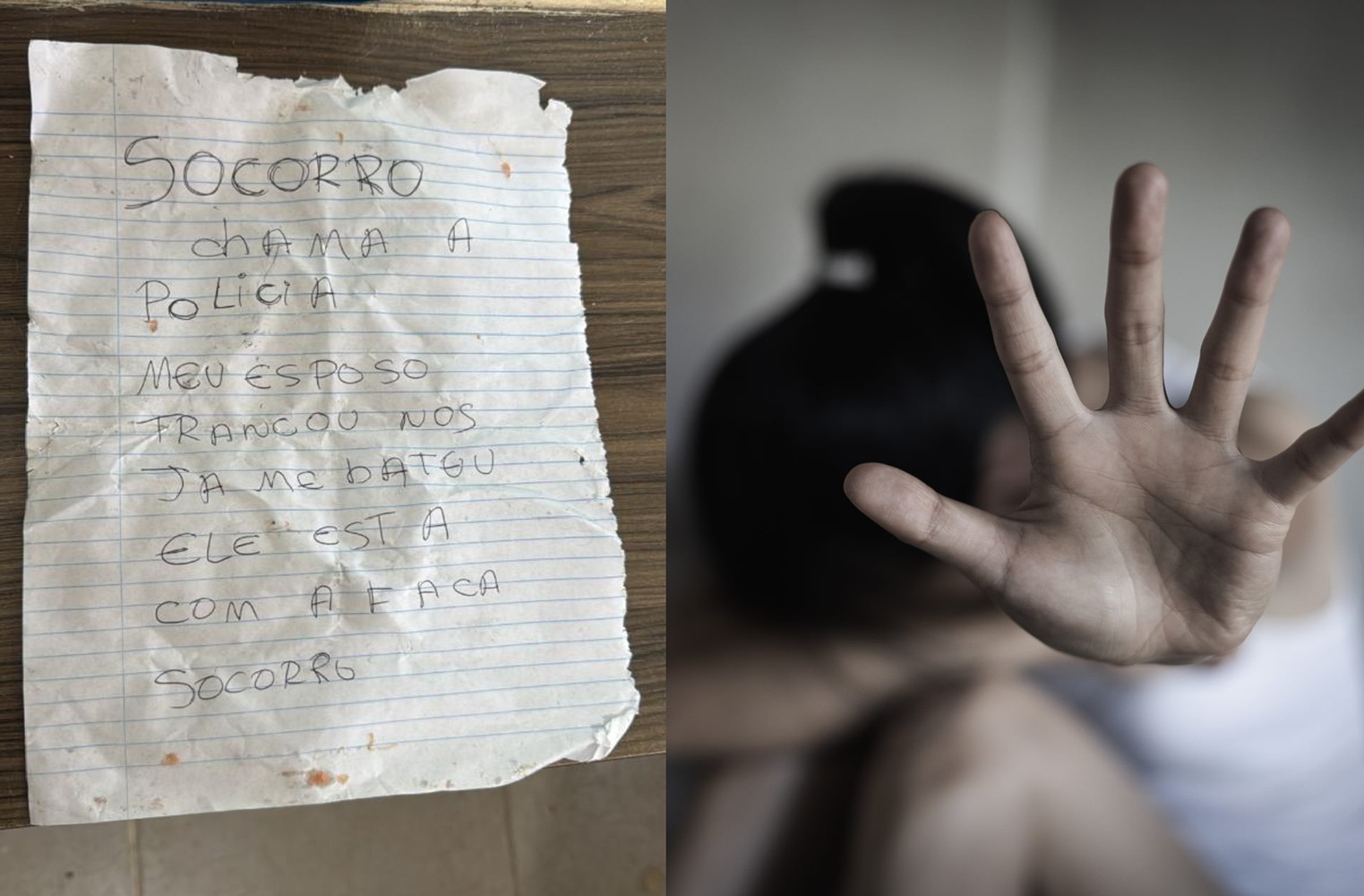 Os policiais militares foram acionados para atenderem a uma ocorrência de possível sequestro em uma residência no bairro Vida Nova II. No local, os militares encontraram um bilhete com a seguinte mensagem. “Socorro, chama a polícia. Meu esposo nos trancou e já me bateu. Ele está com uma faca. Socorro”.