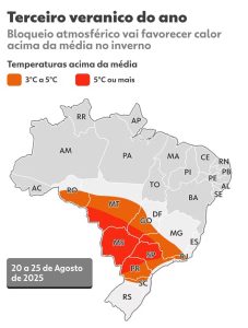 Após um período de frio intenso, uma nova onda de calor — conhecida como “veranico” — deve se instalar sobre o Brasil a partir desta semana. A previsão é de temperaturas acima da média para o mês de agosto, com máximas que podem ultrapassar os 35 °C em várias regiões do país. Em Cuiabá (MT), os termômetros podem chegar aos 40 °C nos próximos dias.