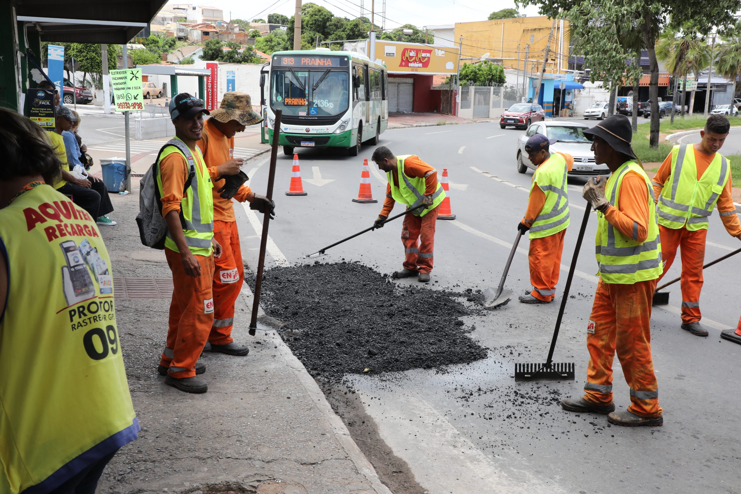 A imagem mostra seis operadores realizando o rastreamento de lama asfáltica colocada na Avenida Tenente Coronel Duarte (Prainha), no bairro Dom Aquino. Eles estão usando uniformes laranja com coletes refletivos. Ao fundo, é possível ver um ônibus com o letreiro indicando o itinerário “313 – PRAINHA”.