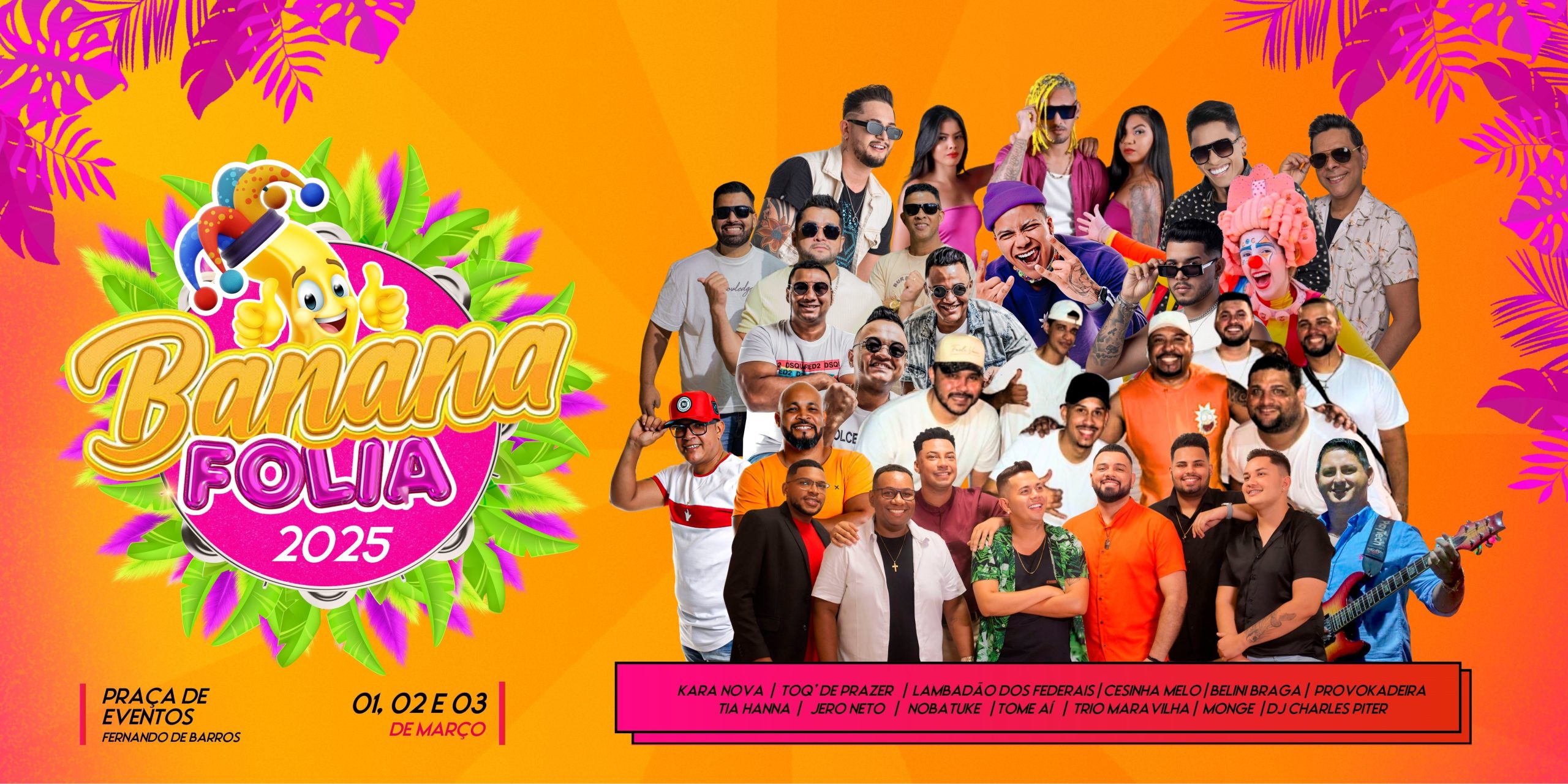 A Prefeitura de Nossa Senhora do Livramento–MT tem o prazer de anunciar a programação oficial do Banana-folia 2025, que acontecerá de 1º a 3 de março na Praça de Eventos Fernando de Barros, no centro da cidade. O evento promete três dias de muita música, diversão e, claro, folia, com entrada gratuita para a população local e visitantes.