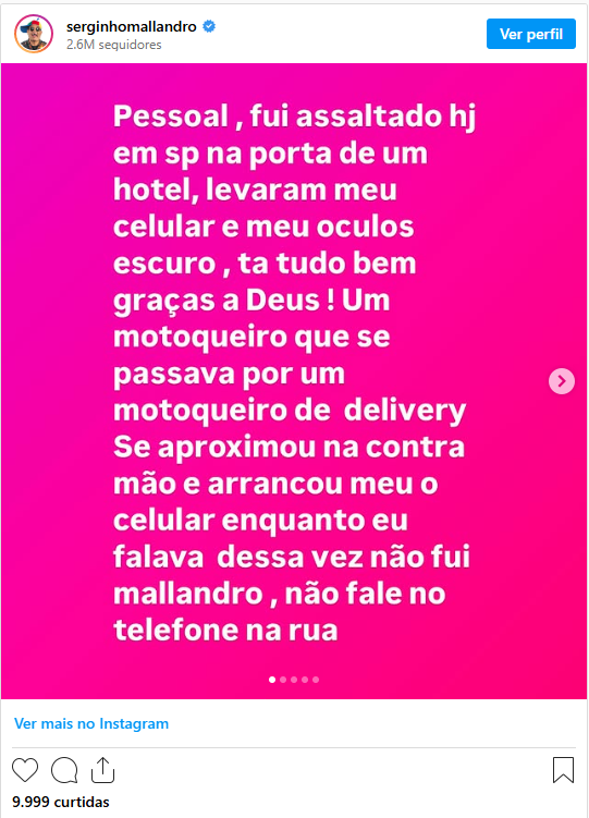 “Dessa vez, não fui malandro”. O comediante aproveitou para alertar seus seguidores sobre os riscos de usar o celular na rua, enfatizando a importância de estar atento para evitar ser vítima de assaltos.