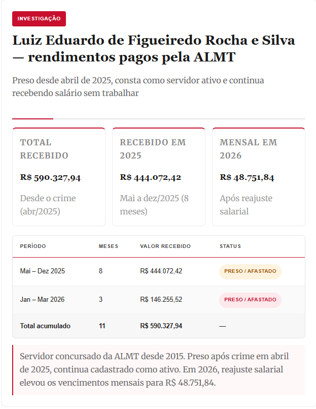 Apesar disso, o ex-procurador segue como servidor efetivo e continua recebendo salários. Ele ingressou na Assembleia em 2015 por concurso público. Após a prisão, em abril de 2025, recebeu R$ 444.072,42 até dezembro. Em 2026, com reajustes e adicionais, a remuneração mensal passou a R$ 48.751,84. Nos três primeiros meses deste ano, os pagamentos somaram R$ 146.255,52.