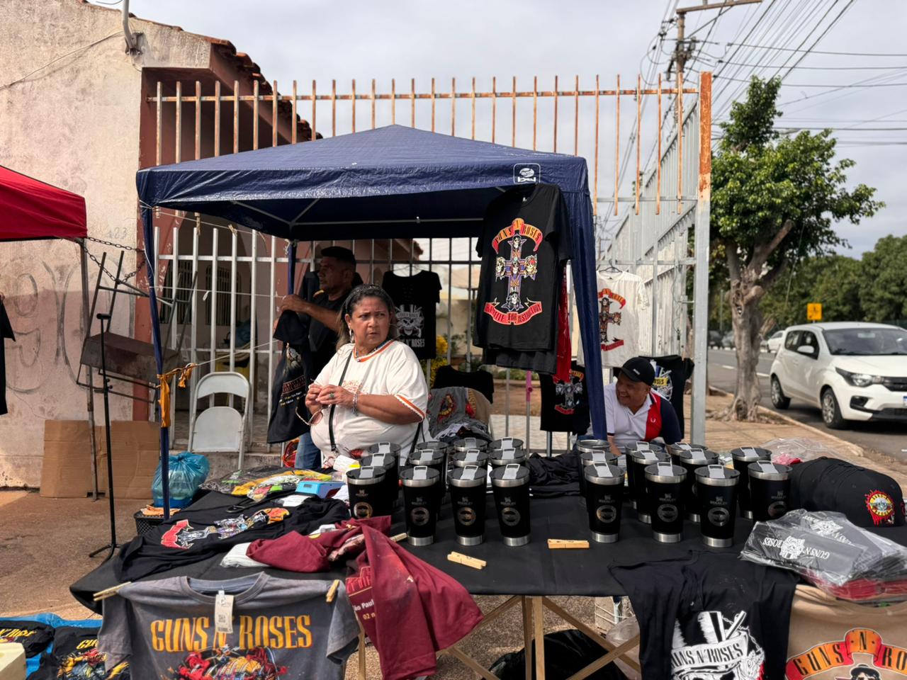 Ela está desde terça-feira (29) posicionada em um ponto próximo à Arena Pantanal, respeitando as restrições e bloqueios no entorno. O movimento, segundo a vendedora, tem sido intenso, com muitos fãs passando pelo local em busca de uma lembrança ou do look perfeito para o show. As camisetas com a estampa da banda são vendidas entre R$ 100 e R$ 110.