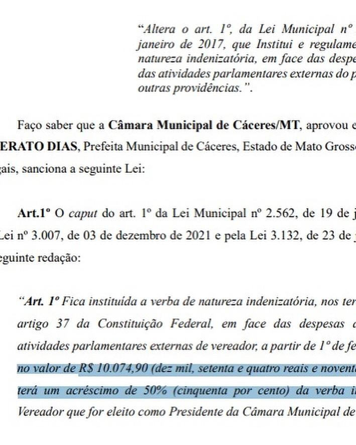 Os vereadores da Câmara Municipal de Cáceres (a 220 km de Cuiabá) aprovaram, durante a sessão ordinária desta segunda-feira (31), o aumento de 28,33% na verba indenizatória de cada parlamentar. A votação, que durou apenas 35 segundos, resultou em um acréscimo de R$ 2.224,90 no valor atual da verba, que passará de R$ 7.850 para R$ 10.074,90 por vereador.