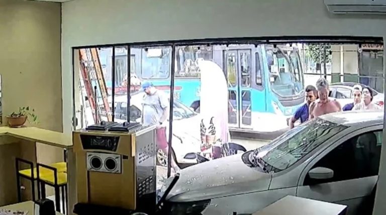 A cena foi registrada por câmeras de segurança e rapidamente repercutiu entre moradores da região. As imagens do circuito interno mostram o momento em que o veículo avança lentamente em direção ao local e quebra as portas de vidro da loja. Durante a situação, um homem que passava pela calçada ainda tentou impedir o impacto segurando o carro com as mãos, mas não conseguiu evitar a colisão.